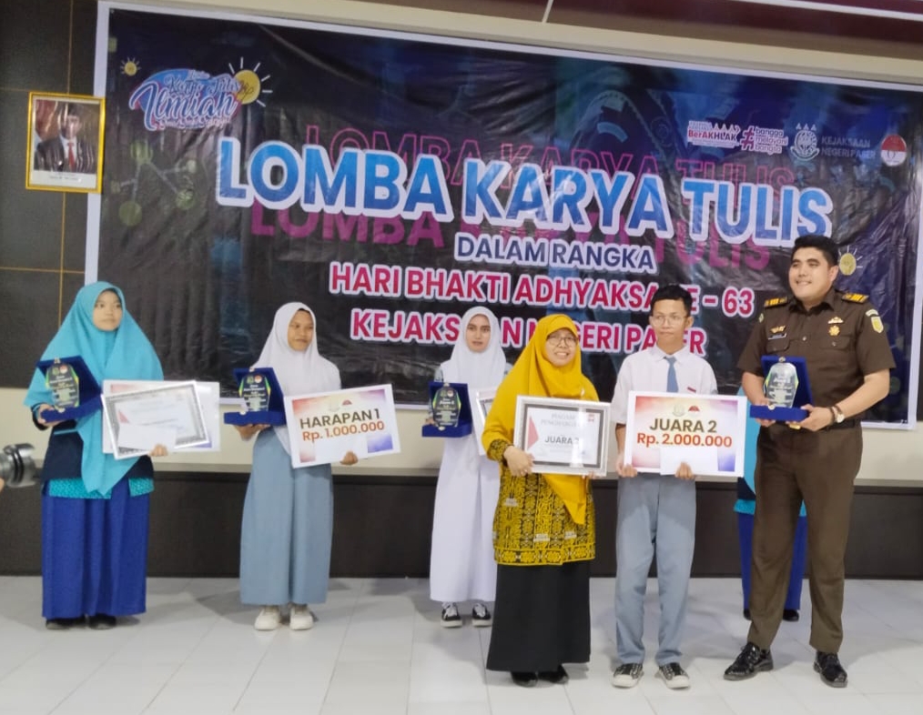 Lomba Karya Tulis Ilmiah yang digelar oleh Kejaksaan Negeri Paser merupakan rangkaian kegiatan yang dilaksanakan dalam rangka memperingati HUT Adhiyaksa ke-63. Kegiatan ini merupakan tahun ke 2 yang bertujuan untuk menciptakan pelajar sadar hukum dengan tema “Implementasi Denda Damai Dalam Perspektif Dominus Litis”. Lomba ini ditujukan untuk seluruh siswa siswi SMA/MA/SMK se-derajat melalui seleksi awal pengumpulan karya tulis dan dipilihlah 5 terbaik sebagai finalis lomba.